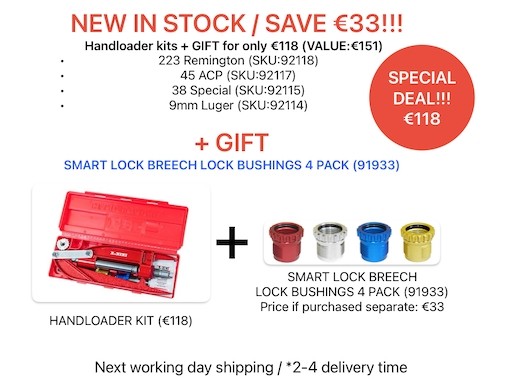 Includes Breech Lock Hand Press,Breech Lock Carbide 3 Die Reloading Set, lock ring wrench, Breech Lock Ram Prime, and molded storage box.